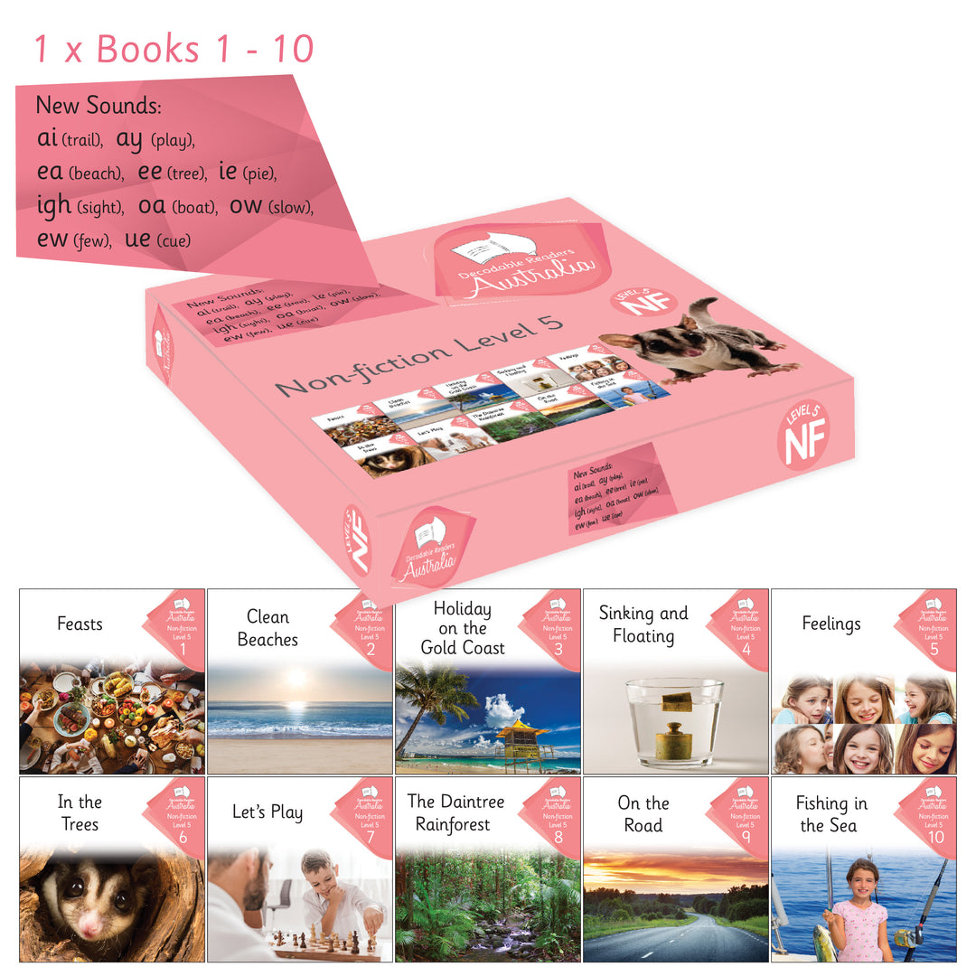 This set of Nonfiction Readers have been created to give children the opportunity to master the identification of the letter/sounds ai (trail), ay (play), ea (beach), ee (tree), ie (pie), igh (sight), oa (boat), ow (slow), ew (few), ue (due), (Level 5 sounds x 10 books) and how to blend and read words using these letter/sounds.