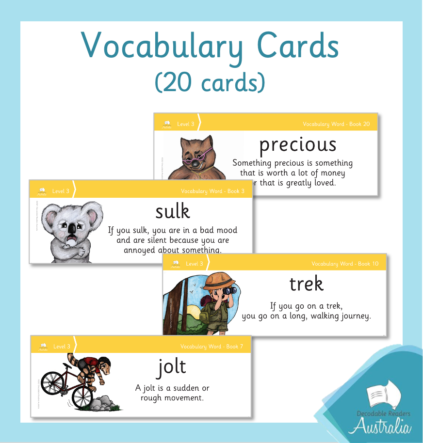 20 x Word Warm Up Cards (double sided) 3 copies of each (60 cards). Each card is connected to the Level 3 books.