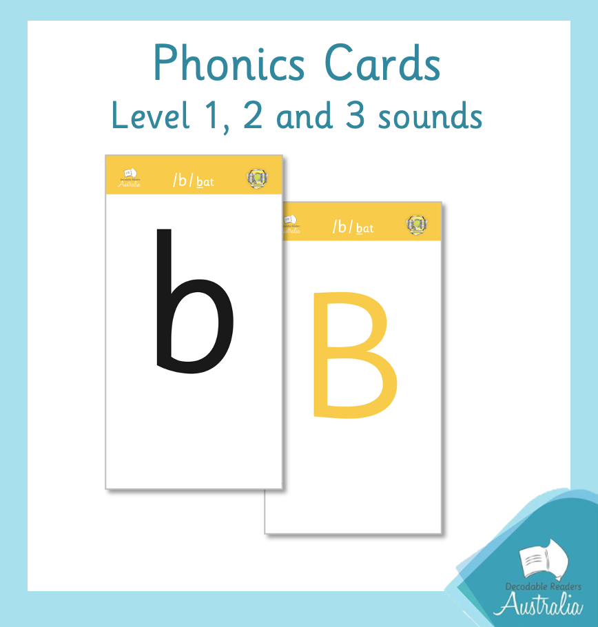 1 x Set of Level 3 Teacher Phonic Cards (double sided with lower case on one side and Uppercase on the other side) This includes Level 1, 2 and 3 sounds.