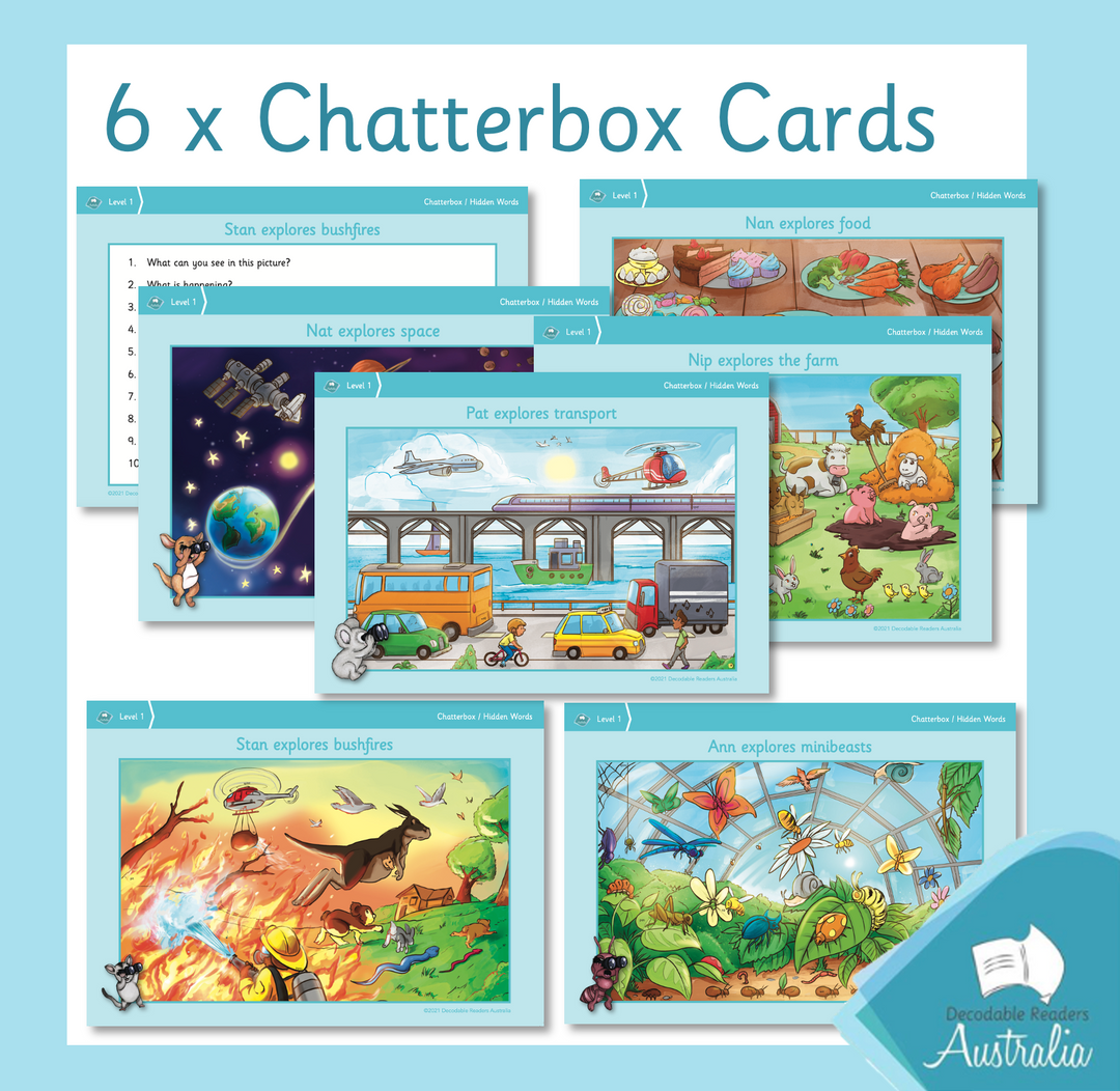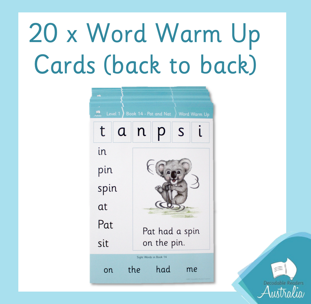 20 x Word Warm Up Cards (double sided) 3 copies of each (60 cards). Each card is connected to the Level 1 books.