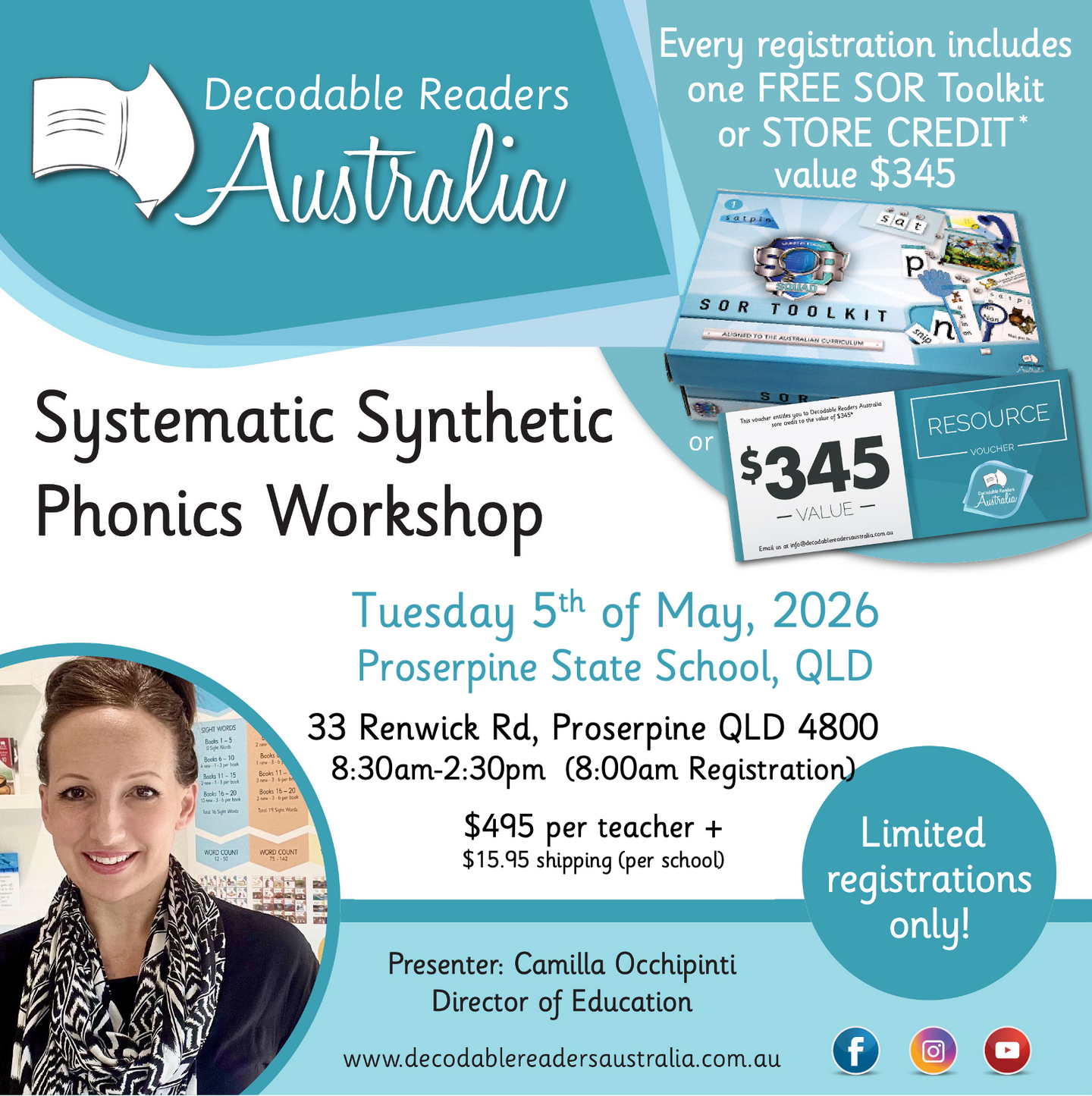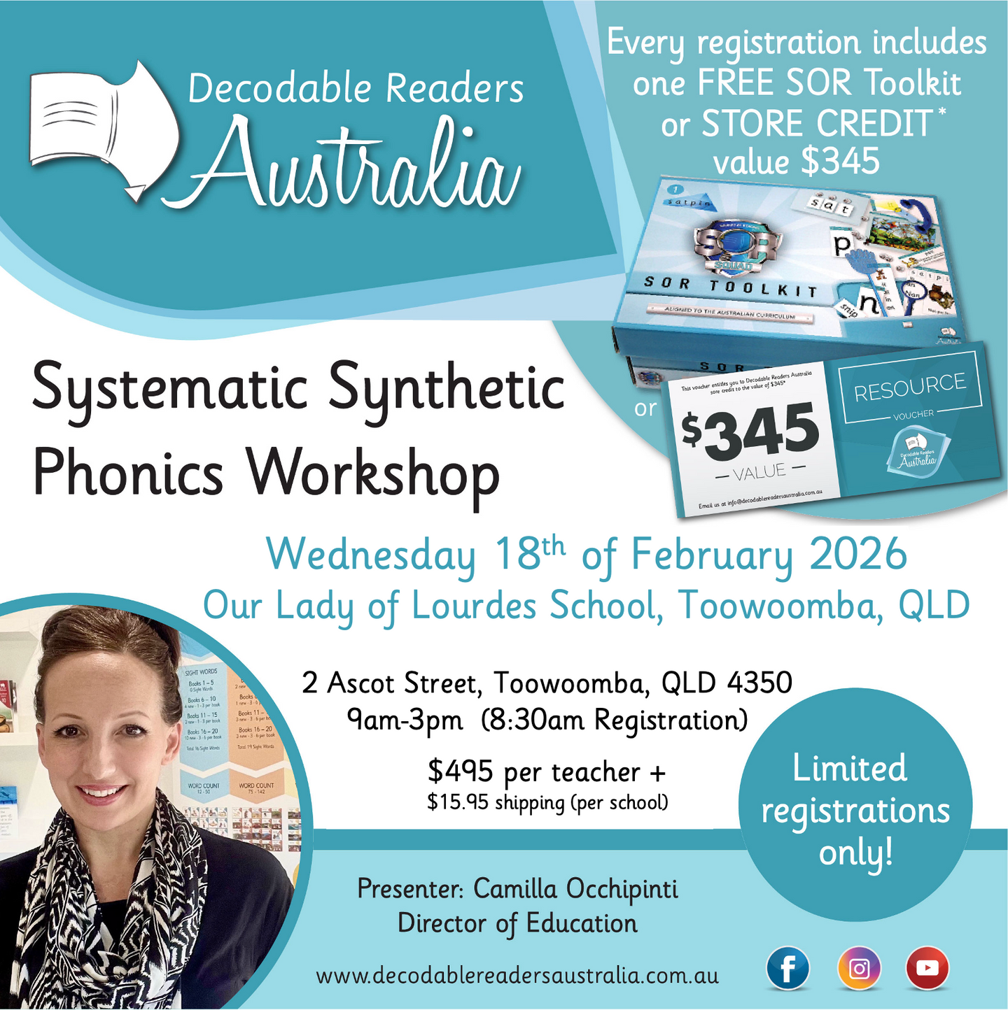Every registration receives a SOR Toolkit with their registration. Toolkits will be sent out a month before the workshop. No refunds available for cancellations, but credit notes may be given based on circumstances. If your school already has toolkits, please contact us as we may be able to provide a credit note for other products for your registration inclusions.
